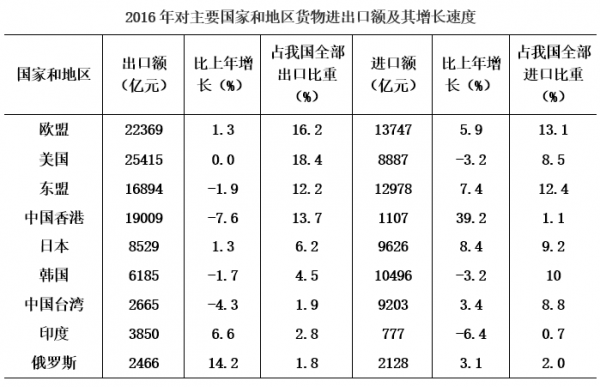 2016年中国货物进出口总额243386亿元,比上年下降0.9%。其中,出口138455亿元,下降1.9%;进口104932亿元,增长0.6%。货物进出口差额(出口减进口)33523亿元,比上年减少3308亿元。