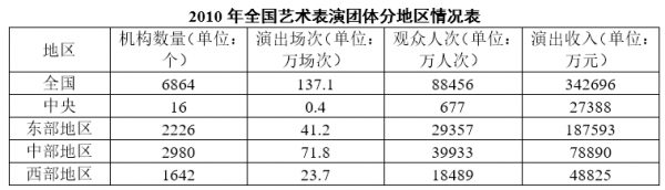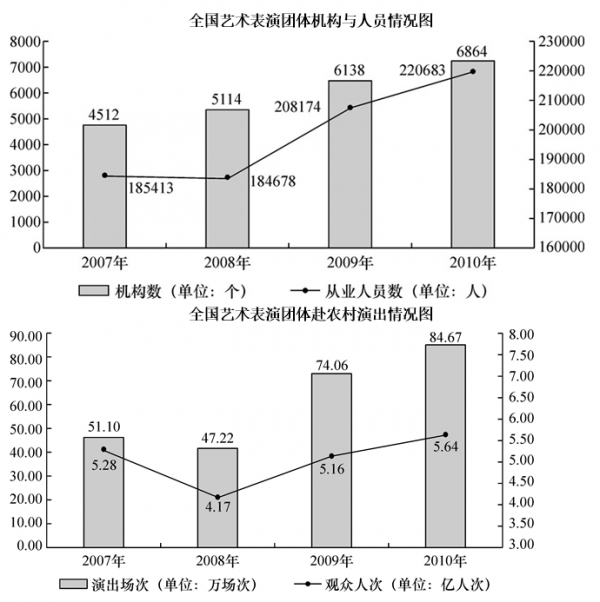 第三步,根据平均数=总数/总个数,且2007—2010年中,每年的单位一致,不再考虑单位转换,数据位数较多,将分母取整后代入公式可得:2007年平均每场次农村演出的观众人数为5.28/51=0.1+,2008年为4.17/47=0.08+,2009年为5.16/74≈0.070,2010年为5.64/85≈0.066,故最少的年份是2010年。