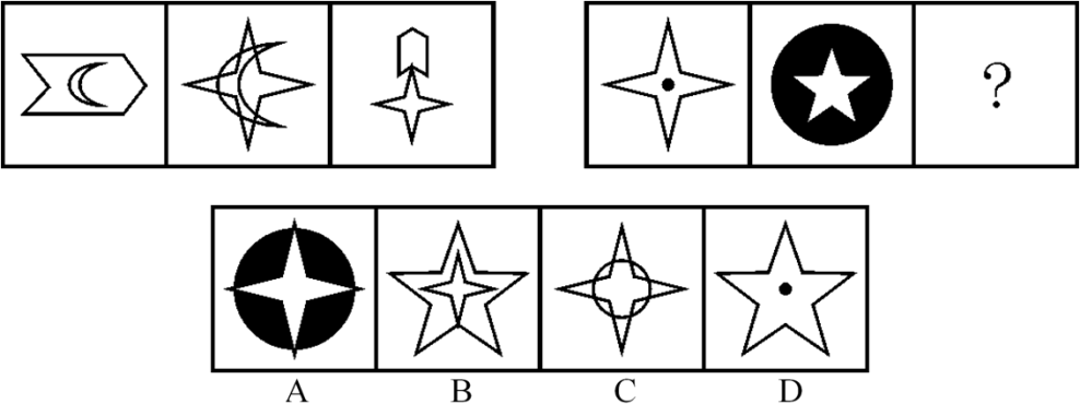 第一步,观察特征。 组成元素相似,优先考虑样式。第二步,两段式,第一段找规律,第二段应用规律。 第一段图1与图2去同求异得到图3,第二段应用上述规律可得B项。 因此,选择B选项。