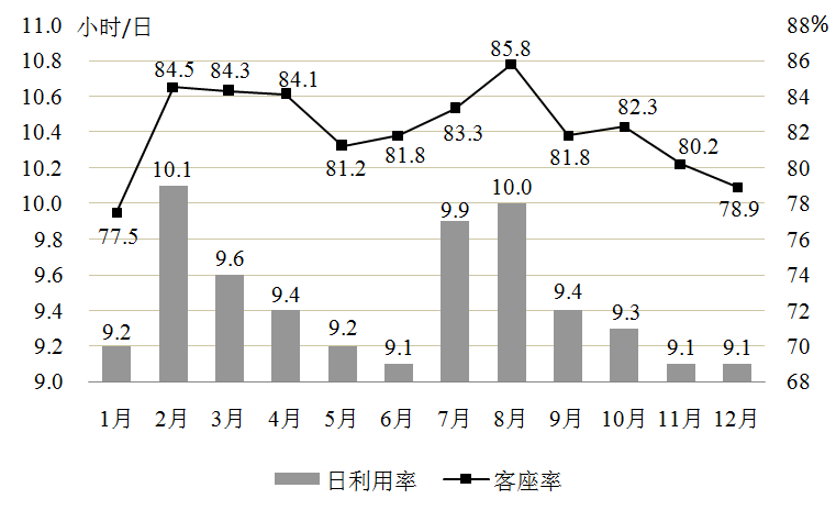 日利用率:飞机在一日内平均提供的生产飞行小时数(小时/日)