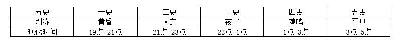 第二步,中国古代将夜间分为五个时间节点,即五更,旧时五更与现代时间对应如下表。