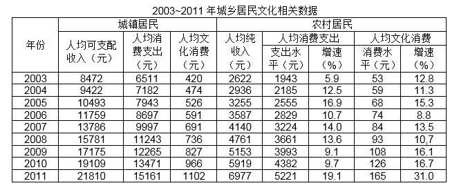 2011年我国城乡居民人均文化消费比2002年分别增长170.7%和251.1%,增速分别快于人均消费支出19和66个百分点。2011年城乡居民文化消费占消费支出的比重分别为7.3%和3.2%,比2002年分别提高0.5和0.6个百分点。