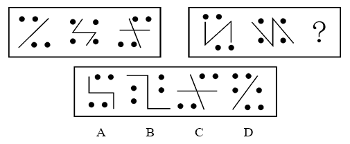 单独看第一段没有规律,考虑两段式遍历。图形由黑点和线条组成,可分开考虑。黑点样式遍历,即第一段第一幅图和第二段第一幅图、第一段第二幅图和第二段第二幅图中的小黑点位置相同,则问号处小黑点的位置应与第一段第三幅图相同,排除B、D项。继续观察线条,发现第一段第一幅图和第二段第一幅图、第一段第二幅图和第二段第二幅图中的直线均能一笔画成,问号处线条笔画数应与第一段第三幅图相同,即至少需要两笔画成,排除A项。