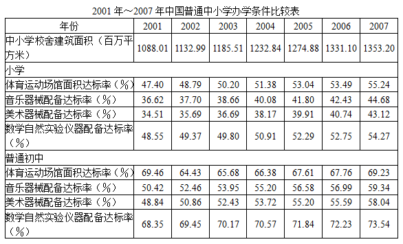 第二步,2001年以来普通初中体育运动场馆面积增速为:(69.23%-69.46%)÷69.46%≈-0.3%;音乐器械配备增速为:(59.34%-50.42%)÷50.42%≈17.7%;美术器械配备增速为:(58.04%-48.84%)÷48.84%≈18.8%;数学自然实验仪器配备增速为:(73.54%-68.35%)÷68.35%≈7.6%。