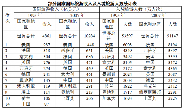在1995年和2007年入境旅游人数均居世界前十位的国家中,2007年入境旅游人数与1995年相比增长速度最快的是: