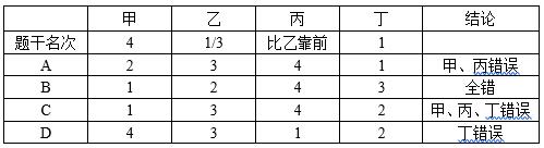 乒乓球单打决赛在甲、乙、丙、丁四位选手中进行,赛前,有些人预测比赛的结果,A说:甲第4。B说:乙不是第2,也不是第4。C说:丙的名次在乙的前面。D说:丁将得第1。比赛结果表明,四个人中只有一个人预测错了。那么,甲、乙、丙、丁四位选手的名次分别为?