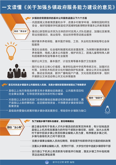 近日,中共中央办公厅、国务院办公厅印发了《关于加强乡镇政府服务能力建设的意见》(以下简称《意见》)。《意见》科学总结近年来各地推进乡镇改革发展的实践经验,明确提出加强乡镇政府服务能力建设的新目标、新任务、新要求,为当前和今后一个时期加强乡镇政府建设,推进基层治理体系和治理能力现代化提供了重要遵循。