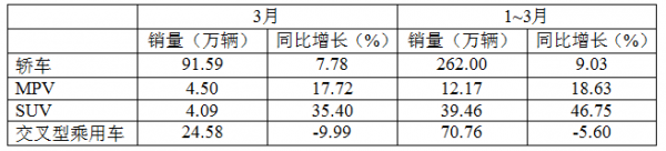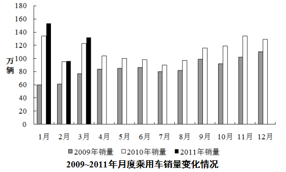 2011年3月,全国乘用车生产138.34万辆,同比增长6.45%,环比增长42.72%;销售134.76万辆,同比增长6.52%,环比增长39.32%。1-3月,乘用车产销分别为375.23万辆和384.39万辆,同比增长8.37%和9.07%。