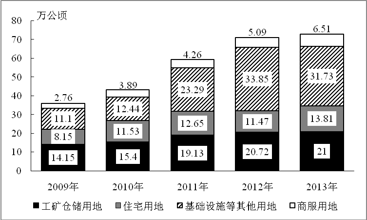B.2010—2013年,基础设施等其他用地面积均高于工矿仓储用地面积