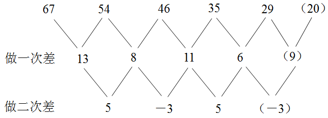 二次差数列是以5,-3为周期的周期数列,则下一项为-3。一次差数列下一项为6-(-3)=9,则所求项为29-9=20。
