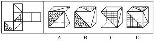 左边给定的是纸盒外表面的展开图,右边哪一项能由它折叠而成?请把它找出来。