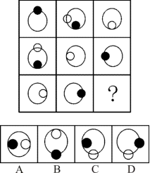 第一行,图1小黑圆与大圆相交,图2小黑圆内切、小白圆与大圆相交,图3小白圆与大圆内切,第二行元素位置关系均与第一行一致,只是出现位置发生变化,属于位置关系遍历,第三行应用规律,问号处应为小黑圆内切、小白圆与大圆相交的图形,只有C项符合。