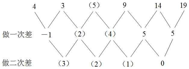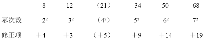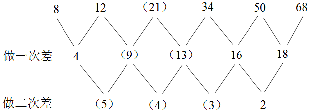 猜测二次差数列是一个公差为-1的等差数列,则二次差数列为3,2,1,0,一次差数列下两项分别为2和4,则所求项修正项为3+2=5,所求项为4²+5=21,代入验证,5+4=9,2+2=4,4+1=5,满足规律。