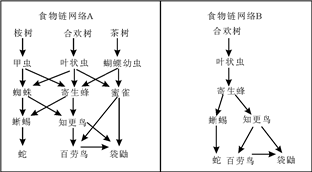 食物链亦称“营养链”。生态系统中各种生物为维持其本身的生命活动,必须以其他生物为食物的这种由食物联结起来的链锁关系,这种摄食关系即食物链。从图中信息来看,在食物链网络A中,叶状虫虽然是三种动物的食物源,但并非是唯一的食物源,即使缺少也不会使食物链断绝。食物链网络B中,叶状虫是寄生蜂的唯一食物源,而寄生蜂则是其他两种动物的唯一食物源,所以网络B缺少叶状虫的影响更大,后果更严重。