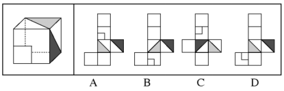 左边这个图形是由右边四个图形中的某一个作为外表面折叠而成,请指出它是哪一个?