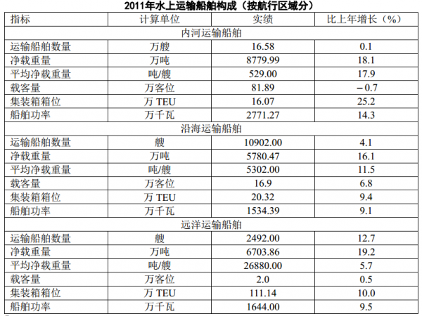 2011年底,全国拥有水上运输船舶17.92万艘,比上年末增长0.5%;净载重量21264.32万吨,增长17.9%;平均净载重量增长17.3%;集装箱箱位147.52万TEU,增长11.4%;船舶功率5949.66万千瓦,增长11.6%。