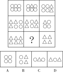 数元素的种类和个数无明显数量规律,元素运算无规律,考虑元素的换算规律。利用元素等差数列的换算公式,应用于第一行无换算规律,利用第二行中可得,图1+图3=2×图2,即(3△+3○)+(3○+△)=2(4△+2○)得到代换公式:1○=2△。将公式代入原图得三角形个数,第一行依次是12、11、10,呈等差规律;第二行依次为9、8、7;第三行依次为6、?、4,因此问号处三角形个数应该为5个,只有C项符合。